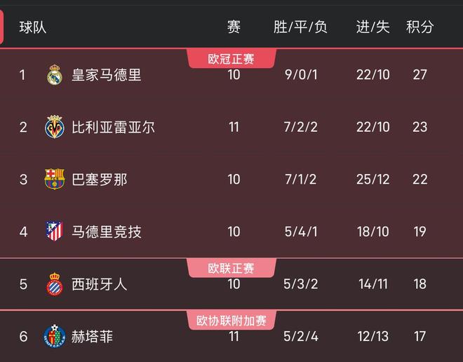 黄潜在先赛的情况下,积分达到23分,反超巴萨暂列次席。
